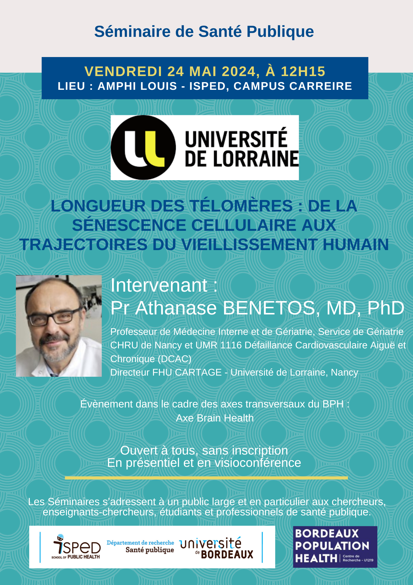 Les séminaires de Santé publique sont coordonnés par le Département Santé publique, le BPH, Bordeaux Population Health - UMR 1219 et l'ISPED, Institut de Santé Publique, d’Épidémiologie et de Développement.
